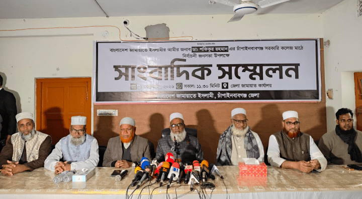 বাংলাদেশ জামায়াতে ইসলামীর আমীর জনাব ডা. শফিকুল রহমানের চাঁপাইনবাবগঞ্জ সরকারি কলেজ মাঠে অনুষ্ঠিতব্য নির্বাচনী জনসভা উপলক্ষে সাংবাদিক সম্মেলন অনুষ্ঠিত হয়েছে। রবিবার (১ ফেব্রুয়ারি) সকাল সাড়ে ১১টায় জেলা জামায়াতে ইসলামীর কার্যালয়ের কনফারেন্স রুমে এ সাংবাদিক সম্মেলনের আয়োজন করা হয়। সাংবাদিক সম্মেলনে জানানো হয়, আগামী ১২ ফেব্রুয়ারি অনুষ্ঠিতব্য ত্রয়োদশ জাতীয় সংসদ নির্বাচনকে সামনে রেখে বাংলাদেশ জামায়াতে ইসলামী ‘জুলাই সনদ’ বাস্তবায়ন, দুর্নীতি ও চাঁদাবাজমুক্ত দেশ গঠন, যুবকদের কর্মসংস্থান সৃষ্টি এবং একটি বৈষম্যমুক্ত কল্যাণরাষ্ট্র প্রতিষ্ঠার লক্ষ্যে নির্বাচনে অংশগ্রহণ করেছে। নেতৃবৃন্দ বলেন, আল্লাহর সাহায্য ও জনগণের ম্যান্ডেট নিয়ে বাংলাদেশ জামায়াতে ইসলামী আগামী দিনে সরকার গঠন করতে চায়। এ সময় তারা আরও বলেন, একটি অবাধ, সুষ্ঠু ও নিরপেক্ষ নির্বাচন নিশ্চিত করতে সিভিল প্রশাসন, পুলিশ প্রশাসন, সেনাবাহিনী, র্যাব, গোয়েন্দা বিভাগ, আইনজীবী, সাংবাদিকসহ সমাজের সর্বস্তরের মানুষের সহযোগিতা প্রত্যাশা করে বাংলাদেশ জামায়াতে ইসলামী।