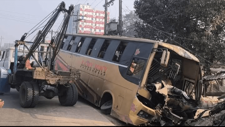 বাগমারা বাজারে নিয়ন্ত্রণ হারিয়ে বাসের ধাক্কা, অল্পের জন্য রক্ষা