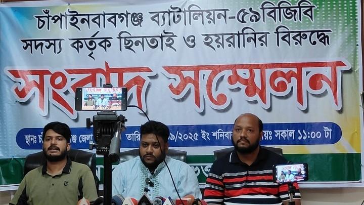 গণঅধিকার পরিষদ চাঁপাইনবাবগঞ্জ জেলা শাখার সাধারণ সম্পাদক আলমগীর কবির সিফতির ব্যাগ থেকে নগদ ৮ লাখ টাকা ও দুটি মোবাইল ফোন ছিনতাইয়ের অভিযোগ উঠেছে মহানন্দা ৫৯ বিজিবি ব্যাটলিয়নের ৪ সদস্যের বিরুদ্ধে। নগদ অর্থ ও মোবাইল ছিনতাইয়ের অভিযোগ তুলে সংবাদ সম্মেলন করেছেন গণঅধিকার পরিষদ নেতা আলমগীর কবির সিফতি। শনিবার দুপুরে চাঁপাইনবাবগঞ্জ জেলা প্রেসক্লাব মিলনায়তনে এই সংবাদ সম্মেলন করেন তিনি। এসময় ব্যাটলিয়ন ক্যাম্পে ওই নেতাকে ডেকে ভয়ভীতি ও মামলার হুমকি দেয়ার অভিযোগ উঠেছে।