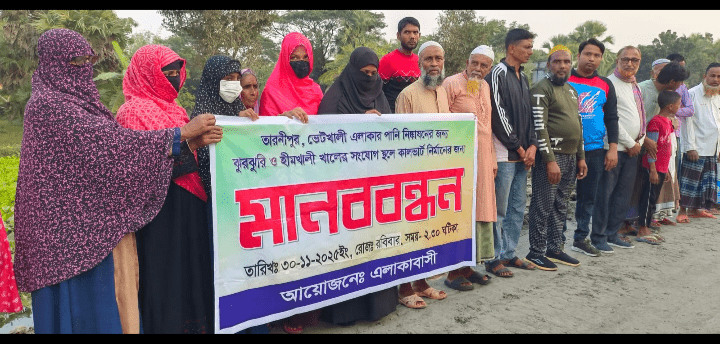 সাতক্ষীরার শ্যামনগর উপজেলার রমজানননগর ইউনিয়নের তারানীপুর-ভেটখালী এলাকার পানি নিষ্কাশনের জন্য ঝুড়ঝুড়ি-হীমখালী খালের সংযোগস্থলে কালভার্ট নির্মানের জন্য মানববন্ধন অনুষ্ঠিত হয়েছে। (রবিবার ৩০ নভেম্বর) বিকাল ৪ টায় তারানীপুর-ভেটখালী জামে মসজিদ সংলগ্নে মানববন্ধন অনুষ্ঠিত হয়। মানববন্ধনে উপস্থিত থেকে বক্তব্য রাখেন সীমান্তবর্তী প্রেসক্লাবের সভাপতি মাহবুব খোকন, জনপ্রিয় অনলাইন ভোরের সংবাদ পোর্টালের সম্পাদক ও আমার দেশ পত্রিকার উপজেলা প্রতিনিধি মনিরুজ্জামান মিশুক, সমাজ সেবক আলহাজ্ব শুকুর আলী, মো. নুরুজ্জামান, প্রাক্তন ইউপি সদস্য রাশিদুল ইসলাম, জয়নুব বেগম, বিএনপি নেতা রবিউল ইসলাম লিটন, শফিকুল ইসলাম, সেলিম খাঁন, রমজাননগর ইউনিয়নের চেয়ারম্যান শেখ আল মামুন, জাতীয় দৈনিক নতুন সময়’র সাতক্ষীরা জেলা প্রতিনিধি জি, এম, আমিনুর রহমান, গণসংহতি আন্দোলন মনোনীত সাতক্ষীরা-৪ এর এমপি প্রার্থী মো. আলফাত হোসেন, সাংবাদিক খালিদ সাইফুল্লাহ। সেলিম খাঁনের পরিচালনায় মানববন্ধনে উপস্থিত এলাকাবাসী বলেন, সাতক্ষীরা সওজ’র অব্যবস্থাপনায় প্রতি বছর বর্ষা মৌসুমে আমরা প্লাবিত হয়। পানি নিষ্কাষনের সু-বন্দোবস্ত না থাকায় আমাদের চলাচলের রাস্তা, ধান্য ফসলের মাঠ, বসত ভিটা, পুকুর পানিতে তলিয়ে যায়। বর্তমানে সড়ক ও জনপদ বিভাগের রাস্তার কাজ চলমান। রাস্তা সংস্কারের পাশাপাশি কালভার্টটি নির্মান করা আশু প্রয়োজন। কালভার্টটি নির্মাণ হলে খালের পানি দিয়ে বিভিন্ন প্রকার ফসল উৎপাদন করা যাবে। তারা আরও বলেন, কালভার্ট নির্মানের বিষয়ে এলাকাবাসীর পক্ষ থেকে জেলা প্রশাসক , সড়ক ও জনপদ বিভাগের প্রকৌশলী ও উপজেলা নির্বাহী অফিসারের নিকট লিখিত আবেদন দেওয়া হয়। কর্তৃপক্ষ সরেজমিনে এসে মাপ জরিপ করার পরে আর কোন পদক্ষেপ গ্রহণ করেন নি। তারানীপুর-ভেটখালী এলাকার পানি নিষ্কাষনের জন্য ঝুড়ঝুড়ি-হীমখালী খালের সংযোগ স্থলে কালভার্ট নির্মানের জন্য সংশ্লিষ্ট কর্তৃপক্ষের জরুরী হস্তক্ষেপ কামনা করছেন এলাকাবাসী।