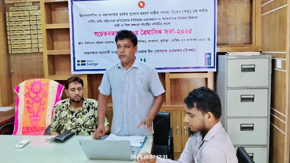 সারিয়া চৌধুরী; উৎপাদনশীল ও সম্ভাবনাময় কর্মের সুযোগ গ্রহণে নারীর সামর্থ্য উন্নয়ন (স্বপ্ন) প্রকল্পের ২য় পর্যায়ের আওতায় নারীর প্রতি সহিংসতা প্রতিরোধে ইউনিয়ন চেয়ারম্যান ও পারিবারিক বিরোধ নিরসন নারী ও শিশু কল্যাণ স্ট্যান্ডিং কমিটির সাথে সচেতনতামূলক ৩য় ত্রৈমাসিক সভা-২০২৫ অনুষ্ঠিত হয়েছে। সোমবার (২৭ অক্টোবর) কুমিল্লার লাকসাম উপজেলার ৪নং কান্দিরপাড় ইউনিয়ন পরিষদ সভাকক্ষে এ সভা অনুষ্ঠিত হয়। সভায় […]
